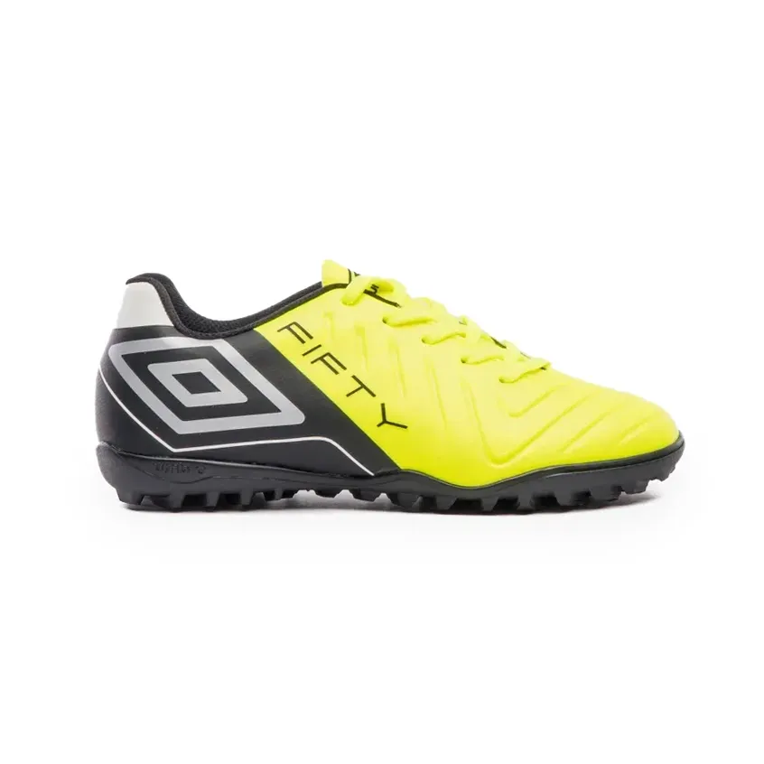 A chuteira Umbro Fifty oferece conforto e ajuste perfeito para jovens jogadores. Seu cabedal laminado garante melhor controle da bola e durabilidade. Ideal para futebol society infantil, com solado especializado para tração e estabilidade.